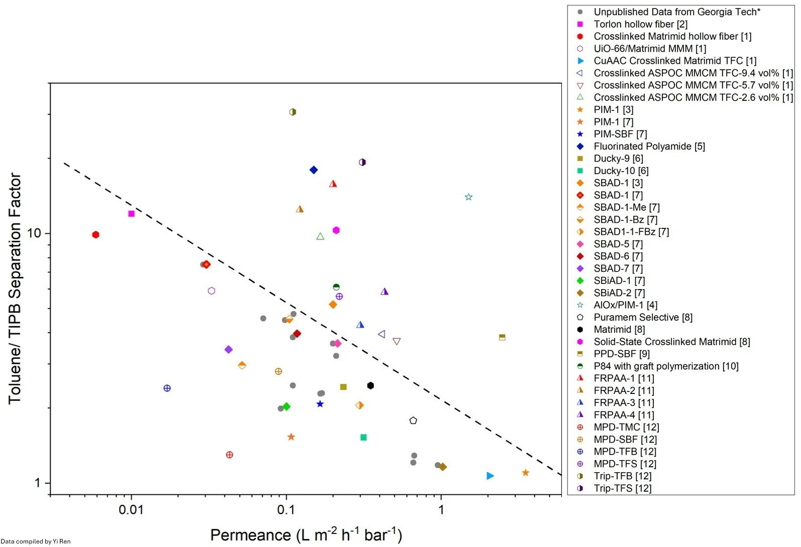 Figure: Cross flow permeation, 10 - 60 bar applied pressure to the membrane, 293 K, 1-10 mol% TIPB. Closed points are all-polymer materials; the open points are composites or non-polymeric materials. (Latest Update: Oct 19, 2025)